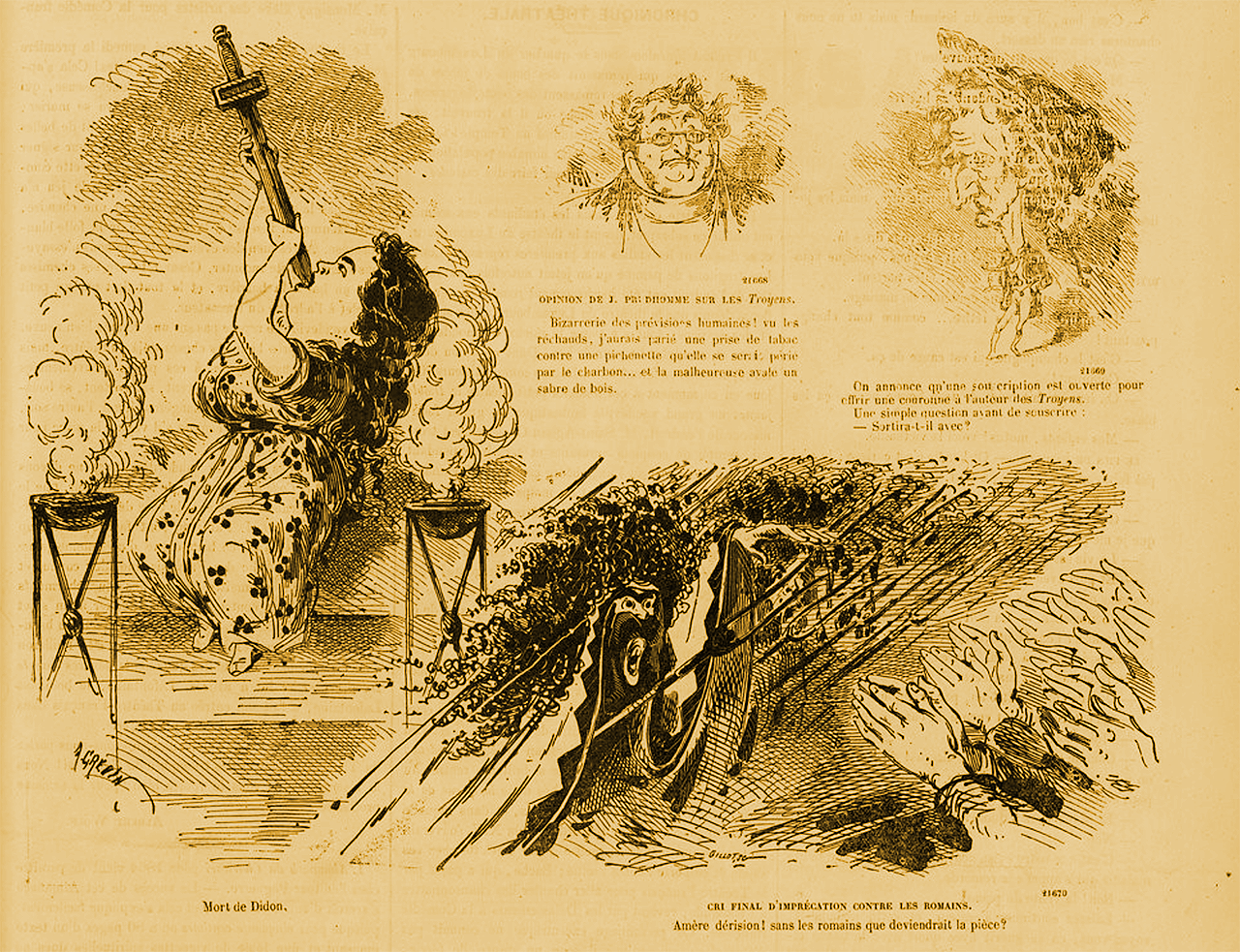 This cartoon was one in a series by Alfred Grévin published in the weekly magazine La Vie Parisienne on November 21, 1863, shortly after the abridged premiere of Hector Berlioz’ massive five-act opera Les Troyens (The Trojans) at the Théâtre de la Ville in Paris.